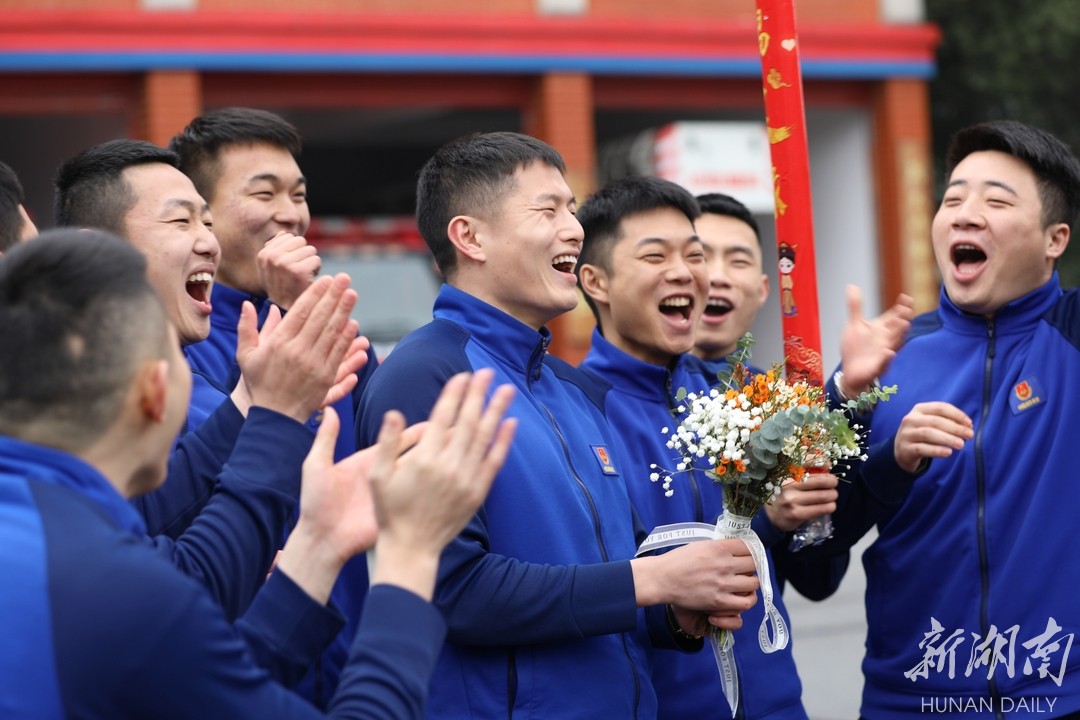 原来,这是队友们为李浩然和李宝乐策划的一场“特别婚礼”。新郎李浩然是湖南常德经开区消防救援大队德山站的一名消防员,他的新娘李宝乐是一名小学教师。