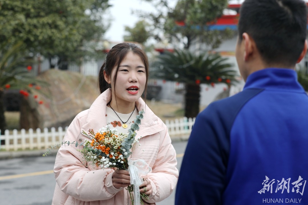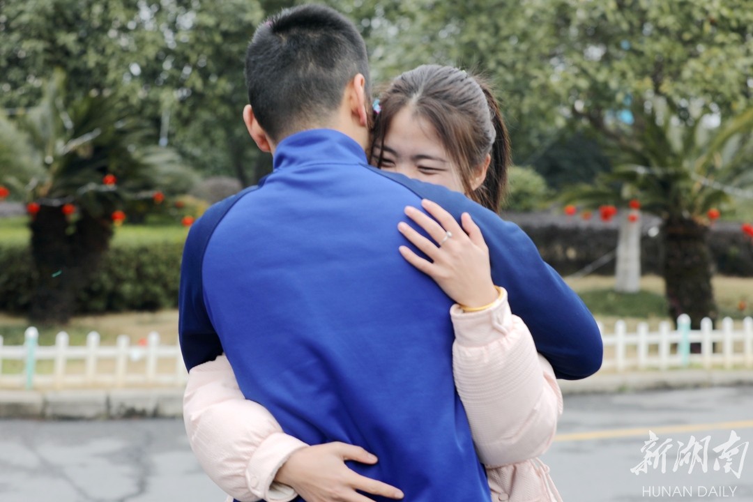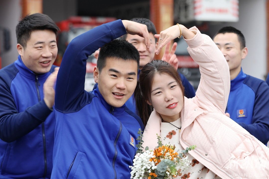 2月10日,一位女孩手捧鲜花走进消防营院。此时,正在进行日常训练的消防员李浩然被班长叫“停”“向后转”,正好与手捧鲜花的新娘李宝乐正面相对。