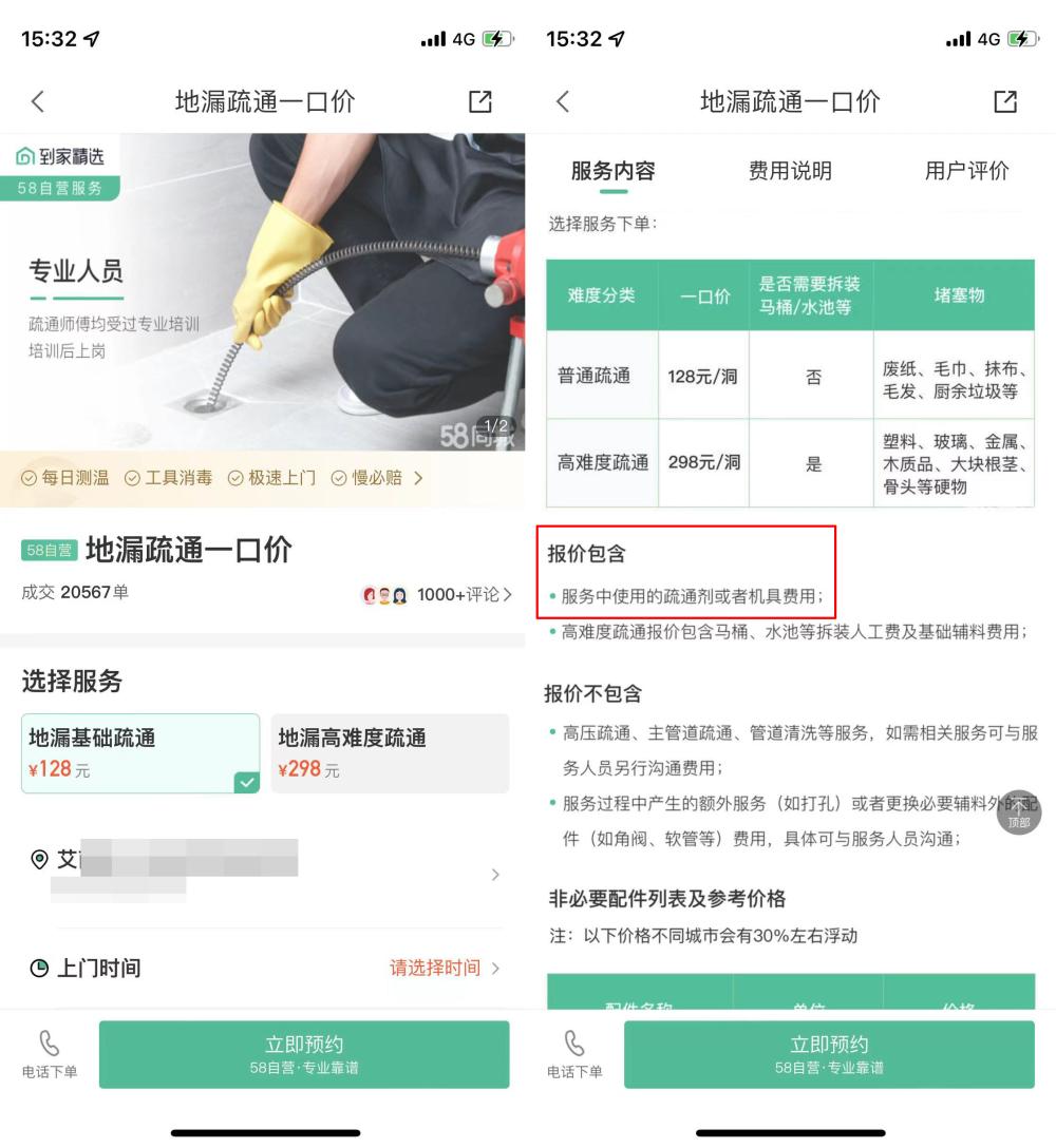 2月7日,由于家中浴室地漏堵塞泛水,上海市民何先生打开“58到家”App,搜索物色上门管道疏通服务。他说,由于曾在该App上使用过上门保洁服务,体验还不错,有一定的信赖度。反复比选后,他选择了标注为“58自营”的“地漏基础疏通”服务。页面显示疏通服务为“一口价”一个洞128元,春节假日期间额外要收取50元的“旺季调度费”,总计178元。页面下方说明中强调,报价中已包含疏通剂和机具的使用费用,只在需要额外的服务和使用额外的配件时,才需要额外支付费用。
