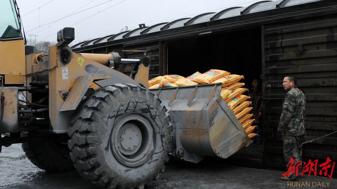在会同县铁路货运点内,一列满载化肥的火车刚刚停靠在了铁路货运卸货点,工人们正在熟练地进行卸货、装车。这些化肥装车之后将被运往会同县广丰农资经营有限公司仓库进行存放。该公司作为全县最大的农资储备供应商和农资中转中心,将持续积极保障各乡镇农资网点货源充足。
