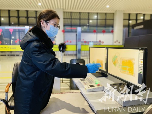 22:05分,在灯火通明的永州火车站进站大厅内,安检员冯雪正仔细地盯着电脑屏幕,对旅客行李物品进行X射线图像判别。