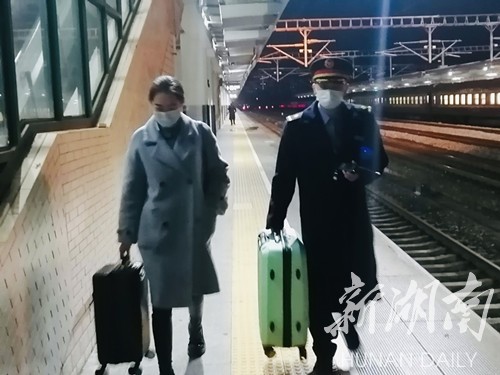 “旅客朋友们,请戴好口罩,注意保管好随身携带的行李物品,大过年的大伙的东西要保管好啊……” 20:05分,在永州火车站二站台,26岁的客运员刘磊正拿着小喇叭,耐心地提醒着上下车的旅客。