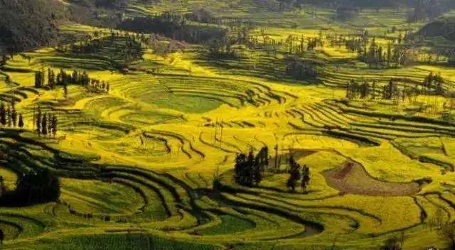 当10万亩之多的一大片油菜花花海,铺满在层层叠叠的龙凤梯田,在古民居的衬托下,梦幻中又添了份别致的层次美。
