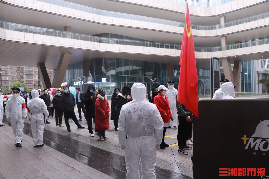 3月21日中午12点,长沙市公安局岳麓分局观沙岭派出所中队指导员叶新友,身着防护服在辖区湘江财富金融中心核酸检测点开展秩序维护工作,一边耐心指引市民注册登记,一边提醒大家保持安全距离,同时还利用排队时间宣传防疫相关知识。