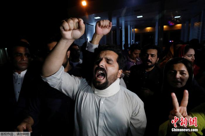当地时间4月10日,巴基斯坦伊斯兰堡,伊姆兰·汗的支持者高呼口号。