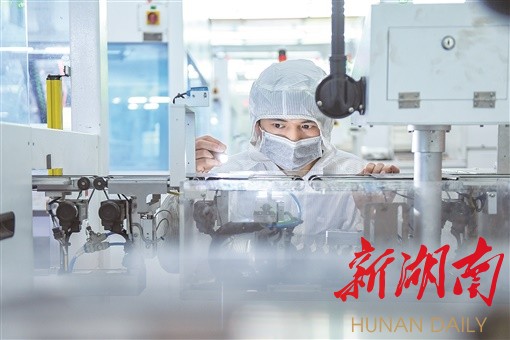 (长沙高新区,湖南红太阳光电科技有限公司600MW单晶PERC智能生产车间内,工人检查电池片质量。湖南日报全媒体记者 辜鹏博 摄)