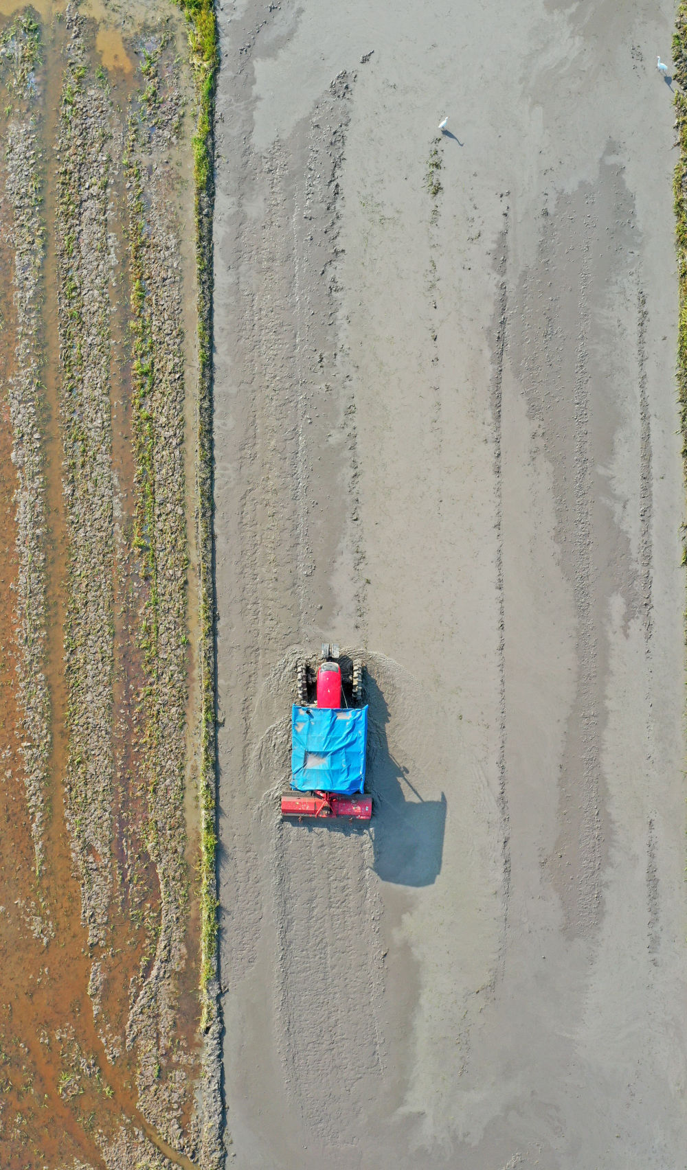 ↑4月7日,在浙江省台州市仙居县下各镇高标准农田,农民驾驶农机在田里耕作(无人机照片)。新华社发(王华斌摄)
