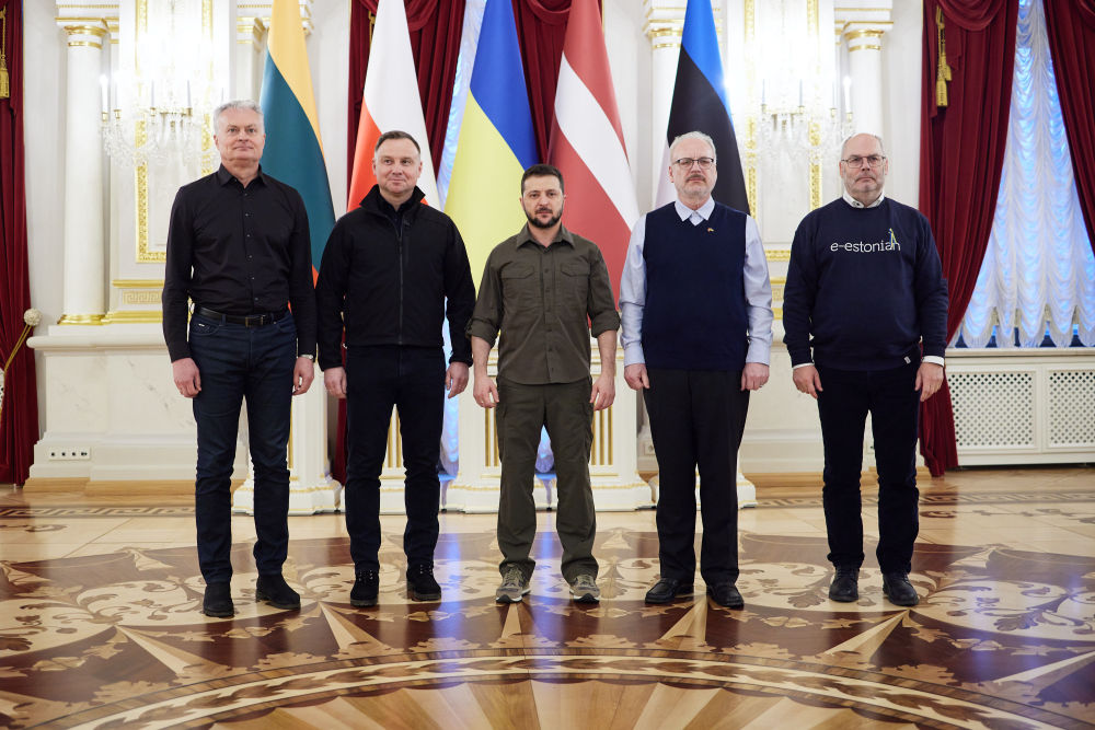 ↑4月13日,乌克兰总统泽连斯基(中)在基辅与到访的波兰总统杜达(左二)、立陶宛总统瑙塞达(左一)、拉脱维亚总统莱维茨(右二)和爱沙尼亚总统卡里斯合影。