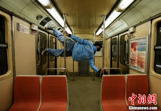 2021年9月21日,智利圣地亚哥,舞蹈教练鲁道夫·罗伯斯在去朋友家准备表演的地铁车厢里排练。