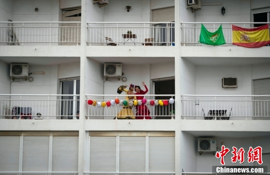 2020年4月25日,西班牙塞维利亚传统四月集市举办的日子到了,由于新冠肺炎疫情的影响,包括斗牛、聚餐和斗舞等项目都已经取消,但这并没有减弱当地居民过节的兴致,图为两名妇女在阳台上盛装起舞。