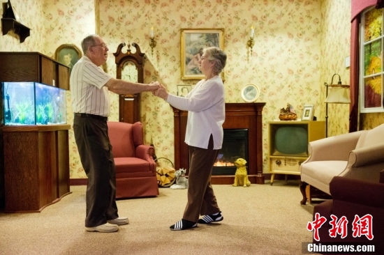 2015年11月6日,美国宾夕法尼亚州养老院伊斯顿之家,患有老年痴呆症的德西玛·阿西和哈里·隆平在一间装修风格为20世纪中期的客厅里随着旧音乐跳舞。越来越多的养老院开始使用辅助生活设施从视觉、声音和其他感官线索来刺激阿尔茨海默氏症和其他形式的痴呆症患者唤醒记忆。