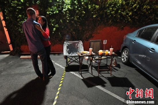 2020年5月23日,贾斯汀·布克曼(左)和贝基·丹尼斯·布克曼在洛杉矶一家意大利餐厅的停车场吃饭时跳舞。在这家餐厅用餐时,顾客们可以预定停车位,并带着自己的桌子,甚至精致的瓷器,享受惬意的用餐时光。