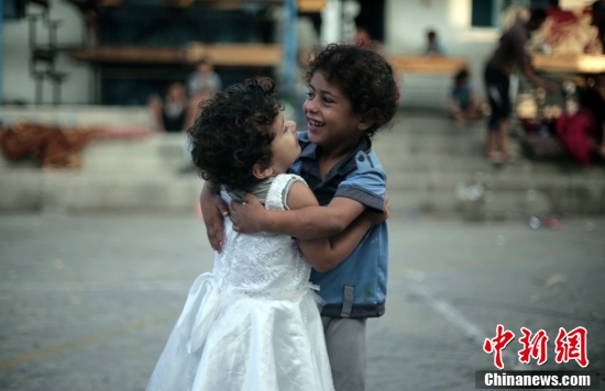 2014年7月28日,加沙地带北部贾巴利亚难民营里两名巴勒斯坦孩子在一所联合国学校里跳舞庆祝开斋节的第一天。数十个因害怕恐袭而逃离家园的家庭在这里寻求避难。