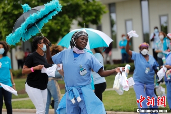 2020年5月15日,美国新奥尔良东部医院外,医护人员在爵士乐团演奏的小夜曲中挥舞着手绢,翩翩起舞。