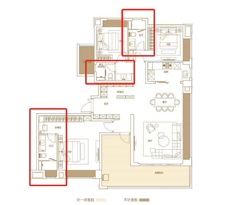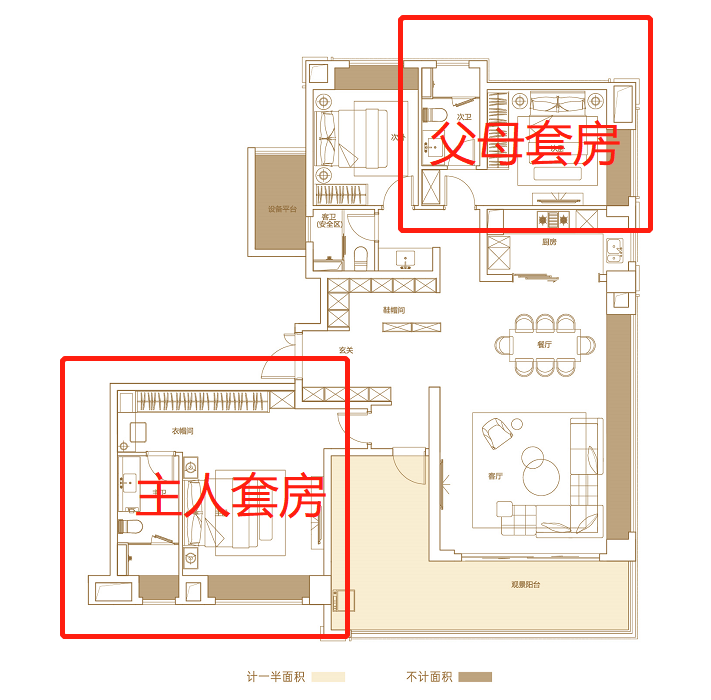 主客卧均配备独立卫生间,做到独立使用避免拥挤,容纳每个人的生活起居,三代同堂,各得其乐。