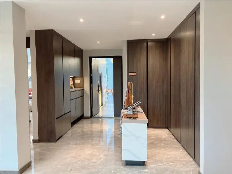 玄关作为入门的D一道屏障,在玄关处就可以完成完整的换鞋、脱衣程序,再配以独立的储物空间,将闲杂物品有序存放,较大程度上能阻挡室外病菌进入,居住也更有安全感。
