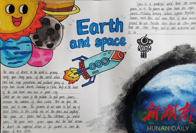 本次英文手抄报活动是以正在学习的湘少版小学英语六年级教材为依托,以“环境保护”和“地球与太空”为主题,老师们特意设计的主题式作业。通过课文学习,借助三球仪等模型,让同学们自行进行观察探索,寻找地球的自转与公转、日夜交替与四季变化的规律。为了更好地展示学生们的学习成果,老师们让学生采取小组合作或独立设计的方式,创作出集知识和趣味于一体的手抄报作品。学生们在作业过程中既体验了跨学科学习的乐趣,培养了动手能力与合作精神,又拓展了视野、锻炼了思维。