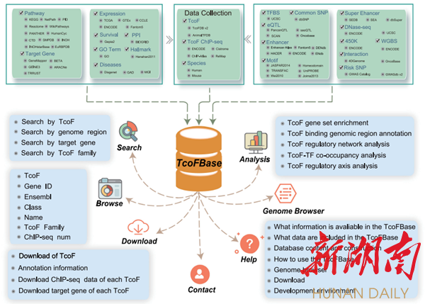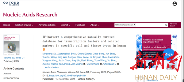 湖南日报·新湖南客户端4月24日讯(王皆清)近期,南华大学附属第一医院李春权教授科研团队在基因转录调控领域取得新的突破性成果。该团队围绕复杂疾病转录因子、转录辅因子方向展生物信息大数据研究,成功在生命科学、生物信息学领域TOP期刊《Nucleic Acids Research》(2022年,第一期)连续发表两篇高水平学术论文(该杂志SCI影响因子16.971)。论文题目分别为《TcoFBase: a comprehensive database for decoding the regulatory transcription co-factors in human and mouse》、《TF-Marker : a comprehensive manually curated database for transcription factors and related markers in specific cell and tissue types in human》。
