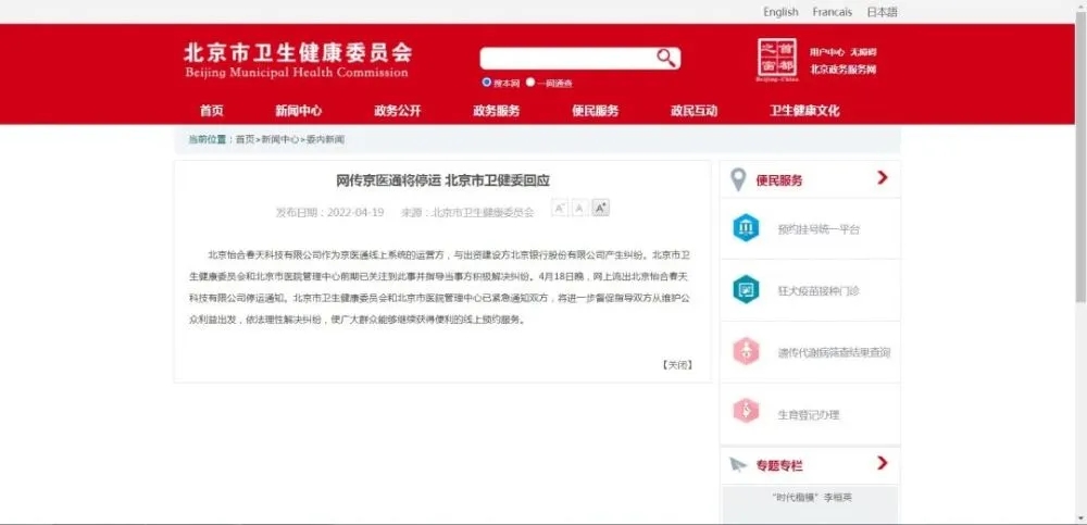 4月18日,一则关于“京医通即将停运”的文件在网上流传。该文件落款章为北京怡合春天科技有限公司,内文称,该公司为京医通线上系统的建设和运营方,北京银行股份有限公司为京医通线上系统出资方,拒绝履行出资义务,该公司独自负担京医通项目数亿元成本长达七年,因无力承担高昂的运营成本,京医通线上系统将于2022年4月20日9时起正式停运。