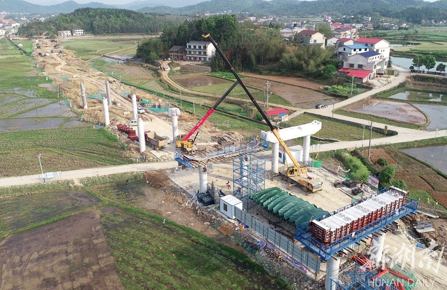4月5日,双峰县杏子铺镇欧源村,醴娄高速公路工地,工人在抓紧桥墩立柱施工。醴娄高速是上海至昆明国家高速公路醴陵至娄底段的扩容项目,全长154公里,主线采用双向六车道高速公路标准建设,设计时速120公里。 乃继辉摄