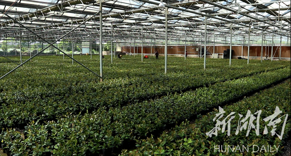 伊塘镇山门口村的永州市云木生态农业发展有限公司恒温大棚内,一盆盆茶花郁郁葱葱,长势喜人。工人们正在清杂除草,调节自动化喷洒设备为茶花施水、控温。目前公司已建成茶花苗木基地1200亩、标准温室大棚3万平方,每年销售主打产品年霄茶花达20万盆。