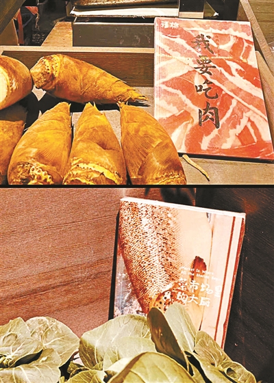 储海飞也跟菜市场的摊主合作,比如在蔬菜旁边放跟肉有关的书,或者教做菜的书,这些书也是可以买的。