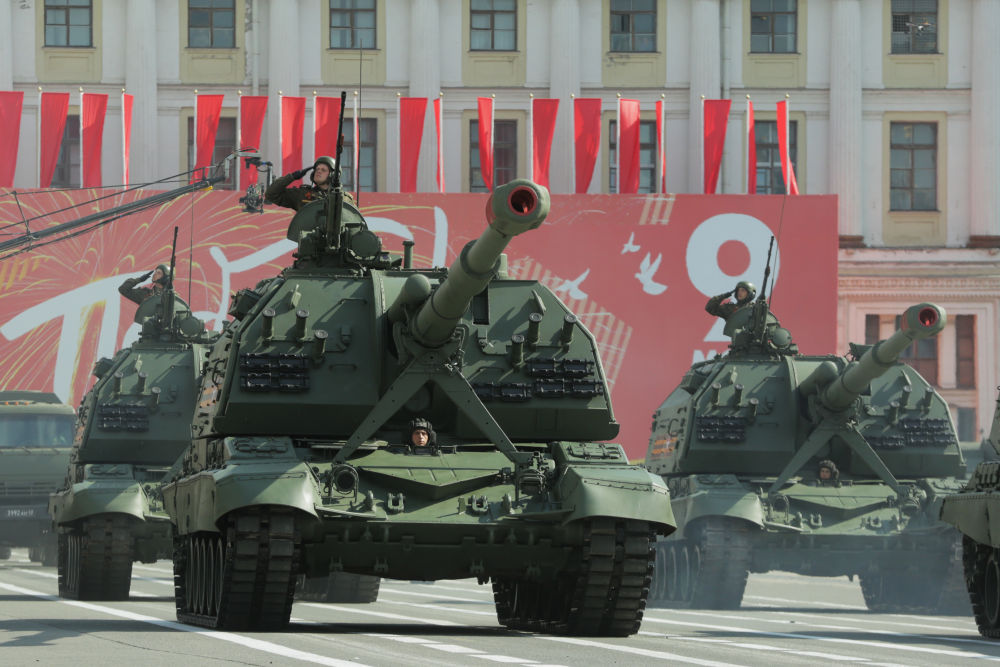 ↑5月7日,自行火炮编队驶过俄罗斯圣彼得堡冬宫广场。