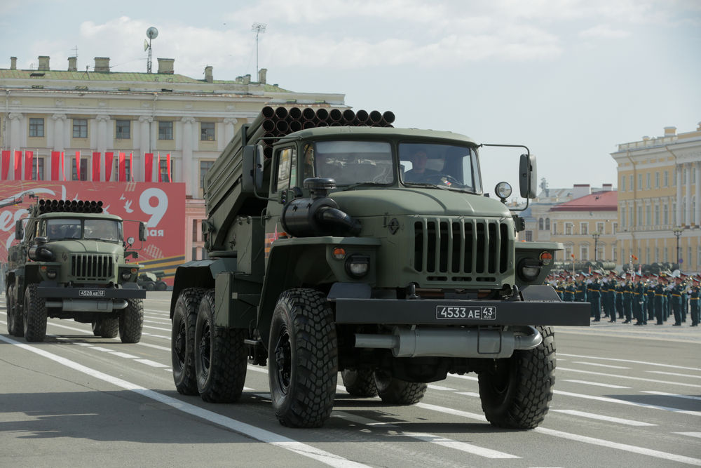↑5月7日,军用车辆驶过俄罗斯圣彼得堡冬宫广场。