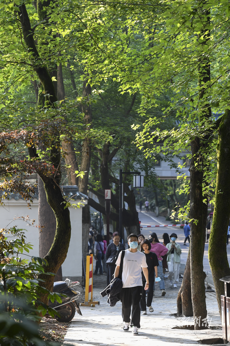 5月16日,市民从南门进入岳麓山景区。当天,岳麓山南门恢复对外开放。游客在进入景区前,需提前通过“岳麓山橘子洲旅游区”官方微信公众号进行预约。为做好当下疫情防控工作,岳麓山风景名胜区实施分时段预约限流机制,前一时段未预约满的游客名额不会结转至下一预约时段,确保各时段游客量合理可控。湖南日报全媒体记者 辜鹏博 摄