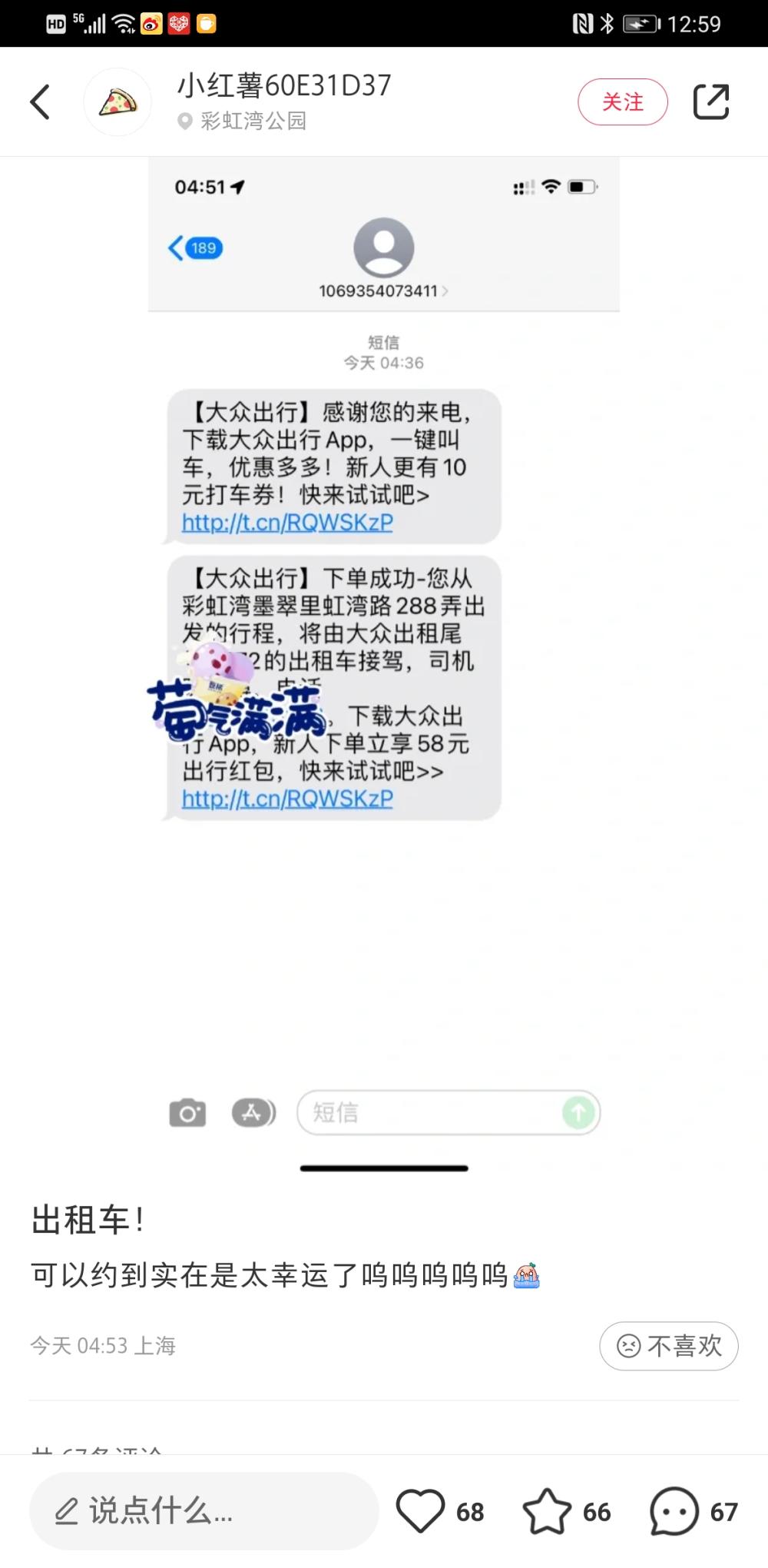 一位离沪者在社交平台上晒出预约到去虹桥出租车的短信截屏。