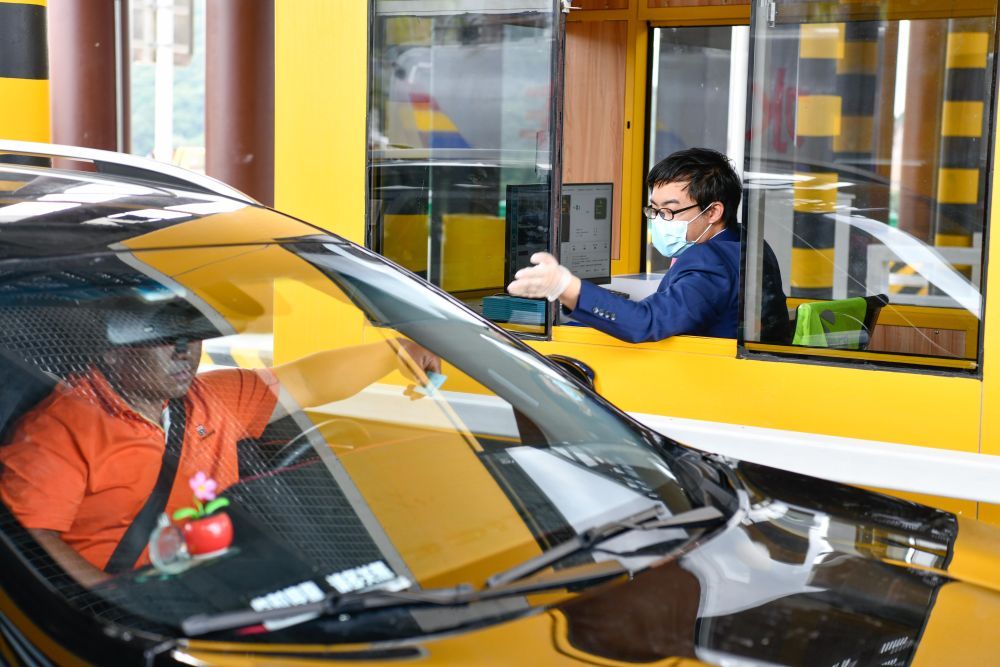 ↑5月31日,在贵黄高速公路贵定北收费站,司机领取通行卡通过收费站。