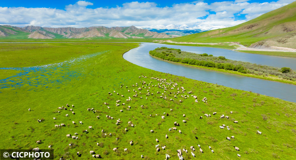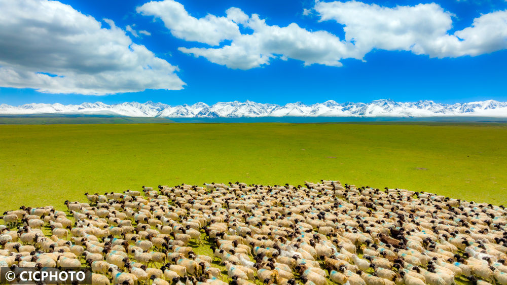 ↑2022年6月5日,在新疆巴音郭楞蒙古自治州和静县巴音布鲁克草原,羊群与蓝天、雪山构成一幅美丽的生态画卷。(无人机照片)CICPHOTO/李飞 摄