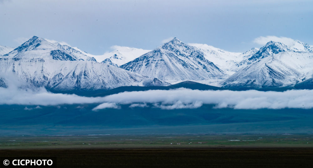 ↑2022年6月5日在新疆巴音郭楞蒙古自治州和静县巴音布鲁克草原拍摄的雨后雪山。CICPHOTO/李飞 摄