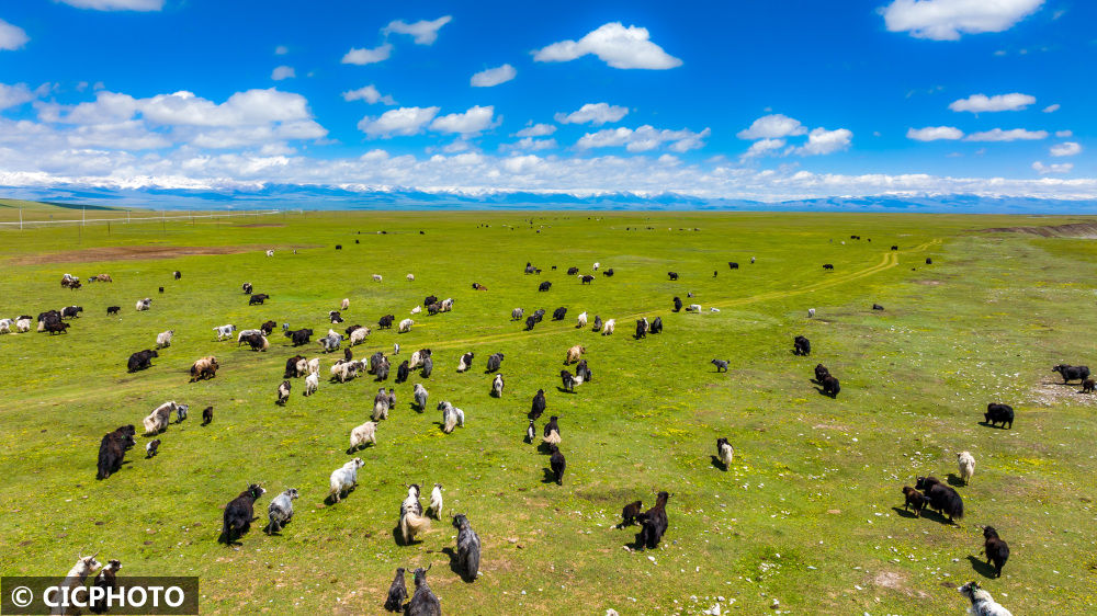 ↑2022年6月5日,在新疆巴音郭楞蒙古自治州和静县巴音布鲁克草原,牦牛与蓝天、雪山构成一幅美丽的生态画卷。(无人机照片)CICPHOTO/李飞 摄