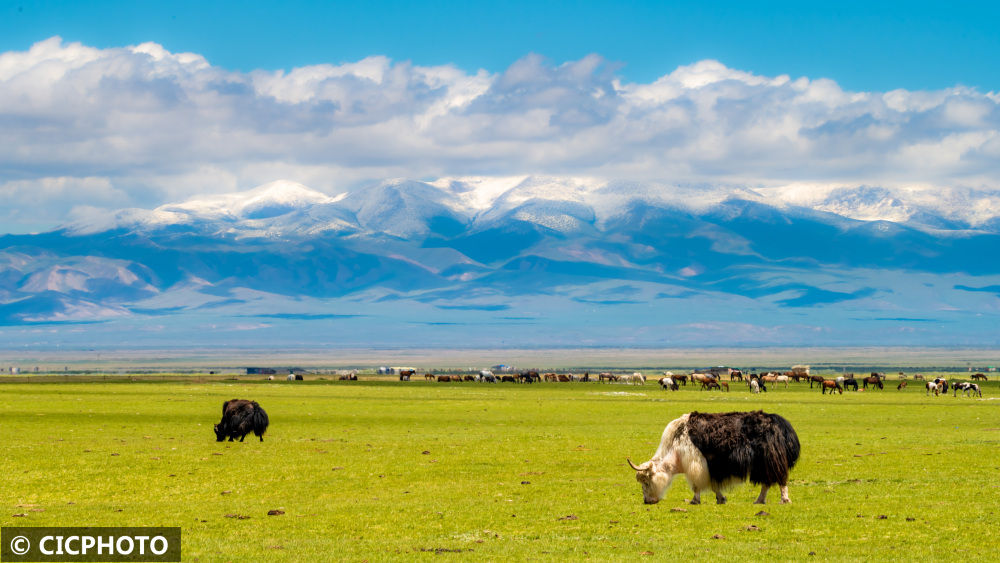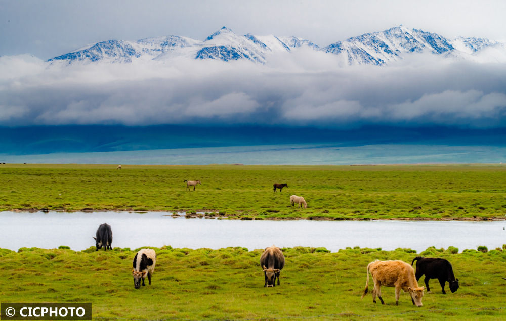 2022年6月5日,新疆巴音布鲁克草原气温回升,雪山、草原和牛羊构成一幅幅美丽的生态画卷。