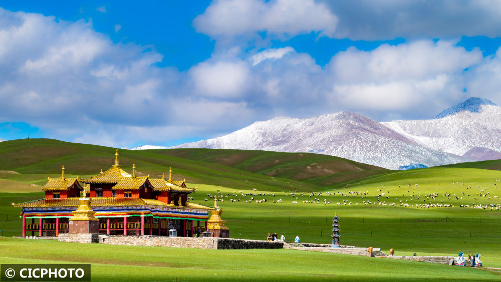 ↑2022年6月5日,在新疆巴音郭楞蒙古自治州和静县巴音布鲁克草原,巴润库热庙与雪山相互映衬,美如画卷。CICPHOTO/李飞 摄