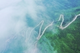 6月9日,云雾中云台山下蜿蜒曲折的盘山公路。图/记者金林
