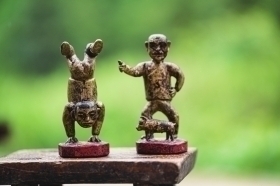 奎溪镇朱多清老人传了4代人的张五郎神像,倒立者是张五郎,另外一位是张五郎收服的梅王。图/记者钱烨