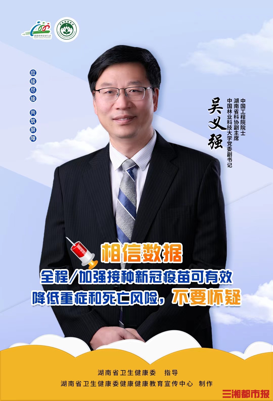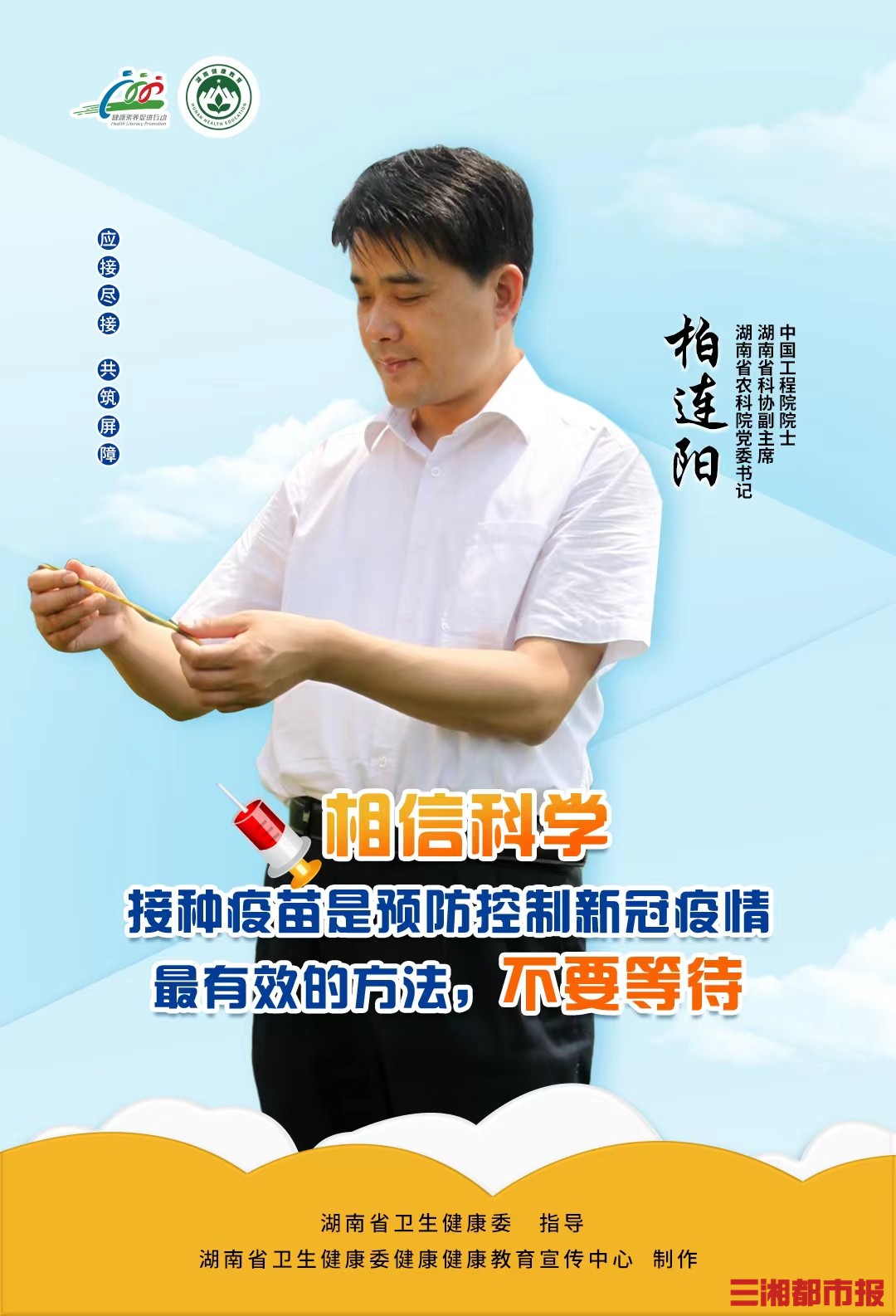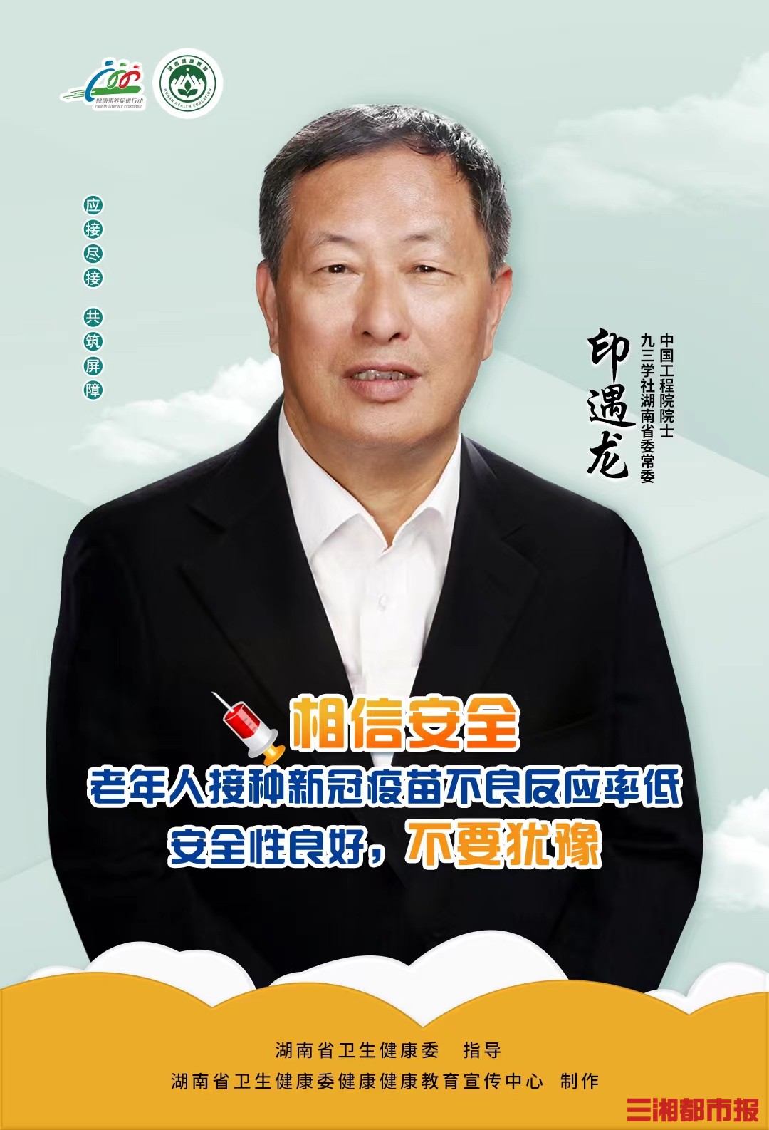 为保障广大老年朋友的健康安全,巩固疫情防控成果,湖南省卫生健康委疾控处、湖南省卫生健康委健康教育宣传中心特邀中国工程院院士柏连阳、吴义强、印遇龙联合发布老年人接种新冠疫苗倡议,进一步扩大接种覆盖面,实现无禁忌症人群“应接尽接”,筑牢免疫屏障。