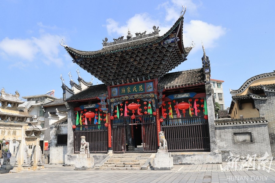 范氏家庙坐落于汝城县卢阳镇益道村三拱门范家村村口,范氏家庙始建于明成化乙已年(公元1485年),占地面积1794平方米,建筑面积907.2平方米,三开间三进,内有两个天井,前厅紧靠大门门楼高大宏伟,斗拱森列,飞檐凌空。双龙戏珠,双凤朝阳的门梁镂雕精巧、工艺细致、气势恢宏。悬挂着“翰林第”“荣禄大夫”“谏议大夫”“通政大夫”“朝议大夫”“振威将军”等匾额,门前双石狮拱卫,庄严肃穆。湖南日报全媒体记者 张京明 摄