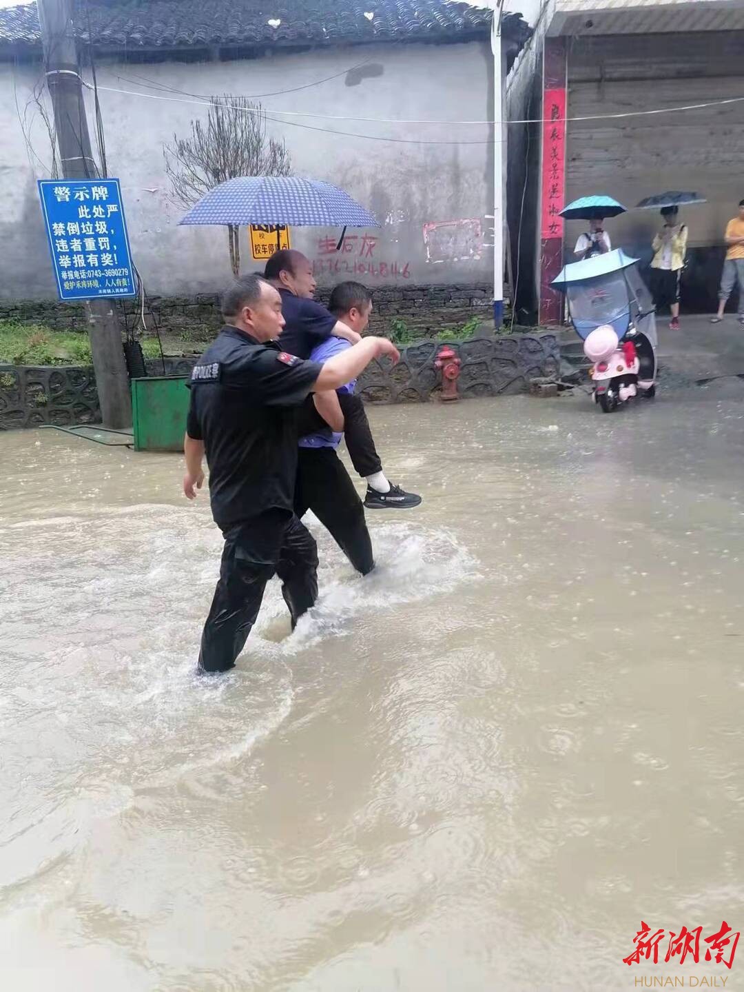 新湖南客户端6月3日讯(通讯员 曹雅璐 龙映飞)6月3日,正是端午节,湘西土家族苗族自治州凤凰县城乡普降大到暴雨。当天中午12:03分,凤凰县禾库镇一超市门前因持续暴雨而积水严重,一中年男子龙某某被困水中,因之前他患有脑梗,现在半身瘫痪,腿脚不便,情势危急。