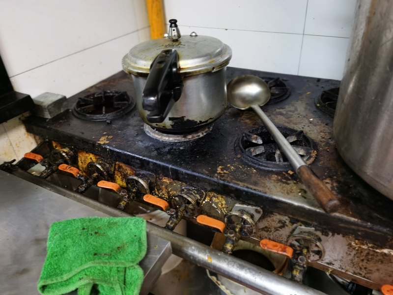 记者注意到,后厨的地面十分湿滑而且油腻,随处可见黑色的不明污渍;一桶没盖子、用了一大半的食用油与没加盖的垃圾桶“肩并肩”;一口大锅盖一头依靠在操作台侧面,另一头就插在一只同样未加盖的垃圾桶上;一口高压锅放置在遍布黑色油污的灶台上;靠近油烟机的一个不锈钢架子上,积满了灰,断了的电线、破口的辣椒油包、用了一半的花椒油瓶、塑料粘合剂挤在一起。此外,该店门口的防虫风幕也没有,有几只苍蝇轻松地飞了进来。
