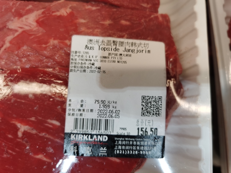 记者扫描一款“澳洲去盖臀腰肉韩式切”(原生产日期:2022年2月15日,分包/称重日期:2022年6月2日)包装上的二维码,跳转至开市客自建的食品安全追溯信息页面,可查看经销企业、供应商、20位数字组成的上海市食用农产品流通安全信息追溯码。