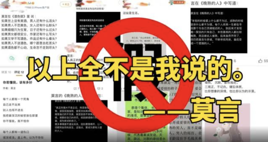 对于这些署名莫言的作品,他表示:“以上都不是我说的。——莫言”,并配上了“告辞”表情包。