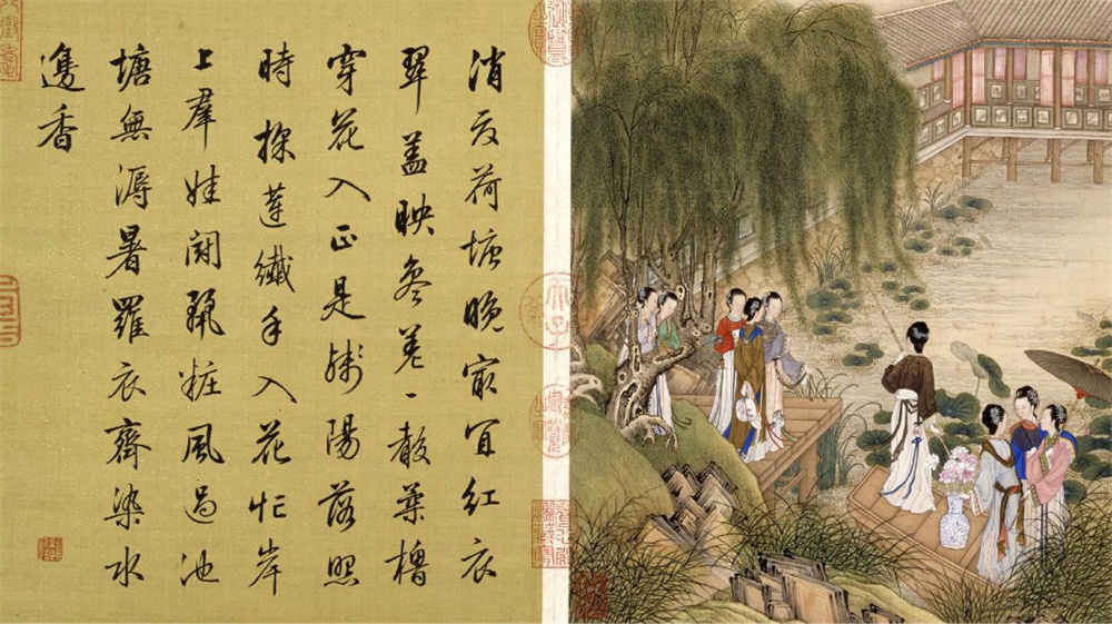 作为六月的避暑花,仕人多插荷于瓶作为文房清供以祛暑。宋杨万里有诗云:“红白莲花共玉瓶,红莲韵绝白莲清。”除了瓶供,士大夫阶层还流行咏荷、画荷、饮荷、食荷的风尚。清代松江画家陈枚曾作《月曼清游图》,在六月的画面中,画家用青蓝笔调层层叠叠涂染出了几顷荷塘。垂柳浓荫中,仕女们有的高楼消暑,有的凭栏垂钓,有的放艇清游,有的池塘采莲,船头还放有鲜插的赏莲,与人一种水上风来,莲香浮动的清凉之感。
