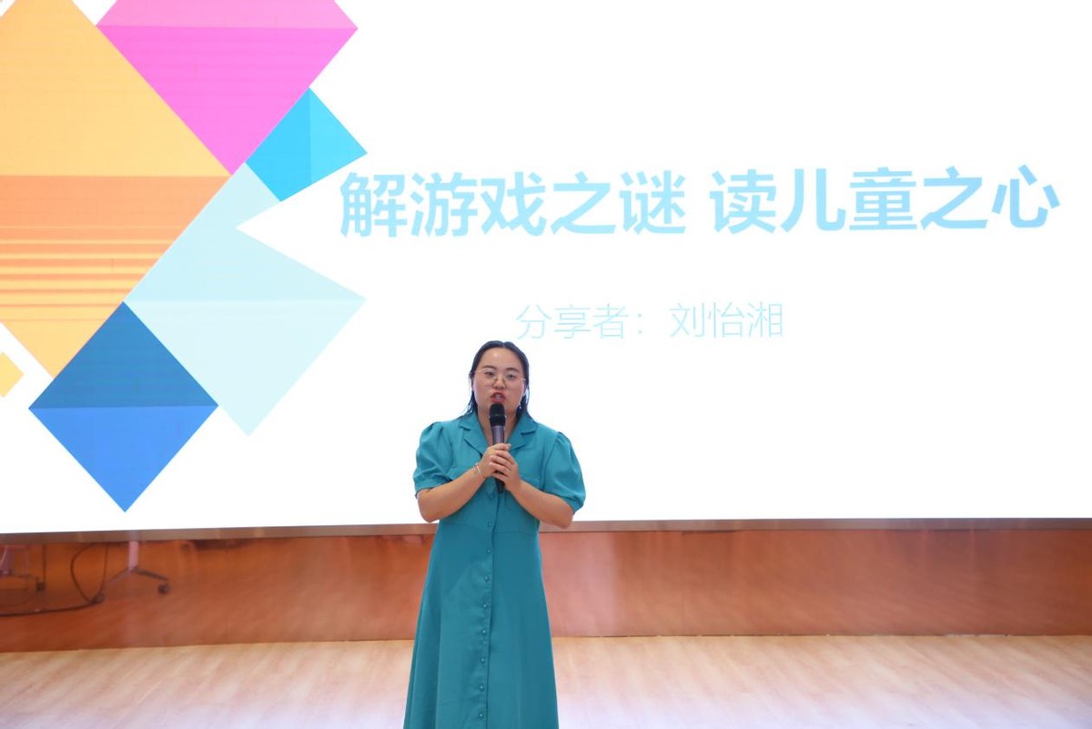 中心园刘怡湘老师结合本园关于自主游戏的组织与实施情况,从初探自主游戏,环境改形、开展自主游戏,教师试行、实行自主游戏,儿童先行三个方面与现场老师展开一场以《解游戏之谜 读儿童之心》为题的经验分享。