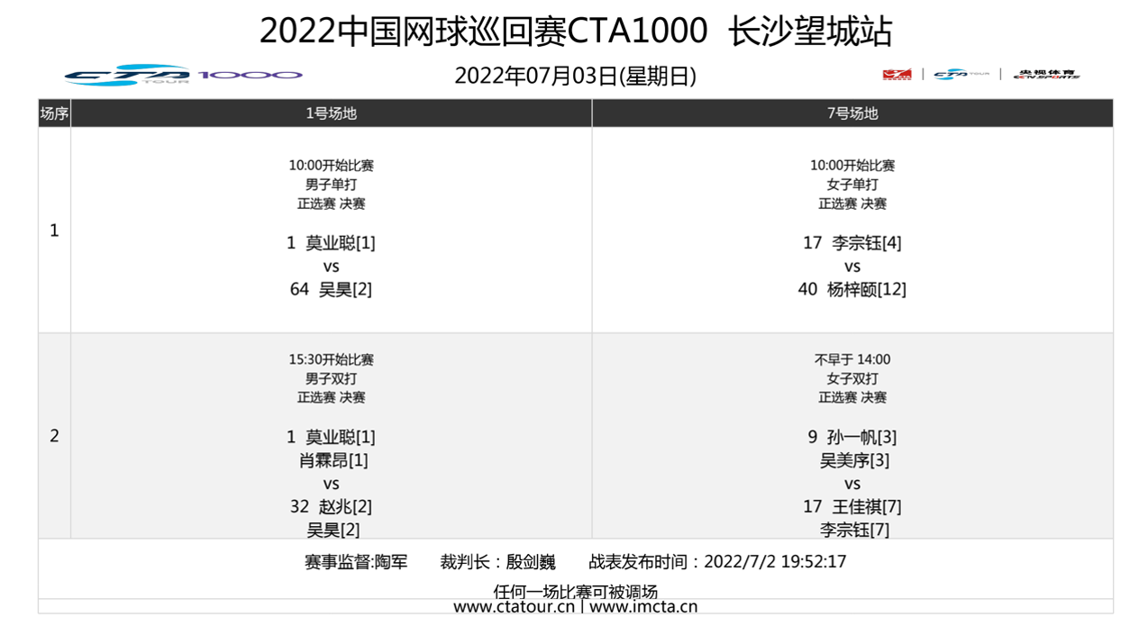 新湖南客户端7月2日讯 (记者 胡旻 实习生 何思羽 彭骏捷)2022中巡赛·长沙望城站经过7个比赛日的争夺,男女单、双打4个项目决赛名单出炉。男单方面,头号种子莫业聪以5战5胜的战绩挺进决赛;女单方面,头号种子郑妩双表现失常,不敌李宗钰。7月3日,2022中巡赛·长沙望城站将上演终极对决。
