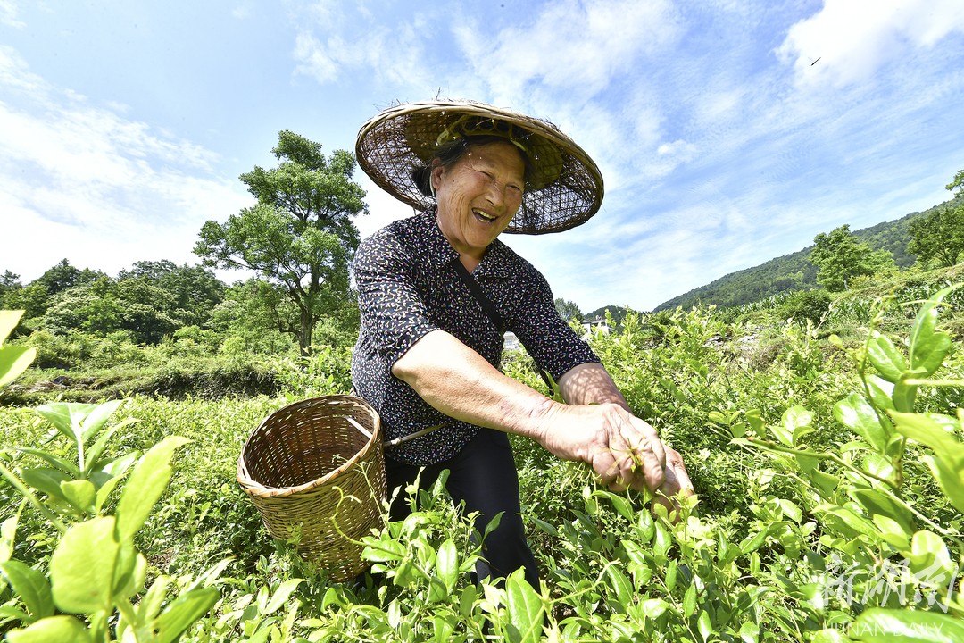 最近,在海拔1200多米的永定区茅岩河镇大米界村莓茶园里,村民们正在采摘鲜嫩的茶叶。