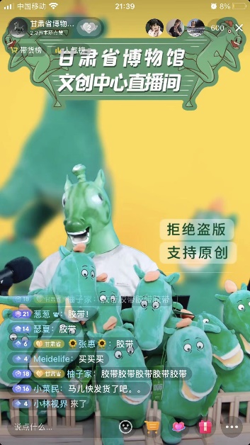 6月27日,甘博文创开启了第一次直播之旅。王海柔介绍,直播间就设在甘博文创销售大厅中,工作人员扮演起“主播”的角色,对着手机中的粉丝,磕磕绊绊开始尝试。让他们分外惊喜的是,这场直播收获了10万+的在线人数,直播结束的第二天,甘博门口就排起了长队,很多游客特意改变行程来到甘博,只为一睹“绿马”“芳容”。