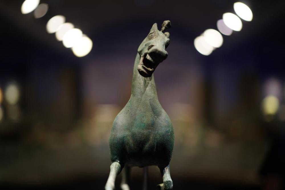 2021年5月15日在甘肃省博物馆拍摄的对外展出的铜奔马复制品。图片来自新华社